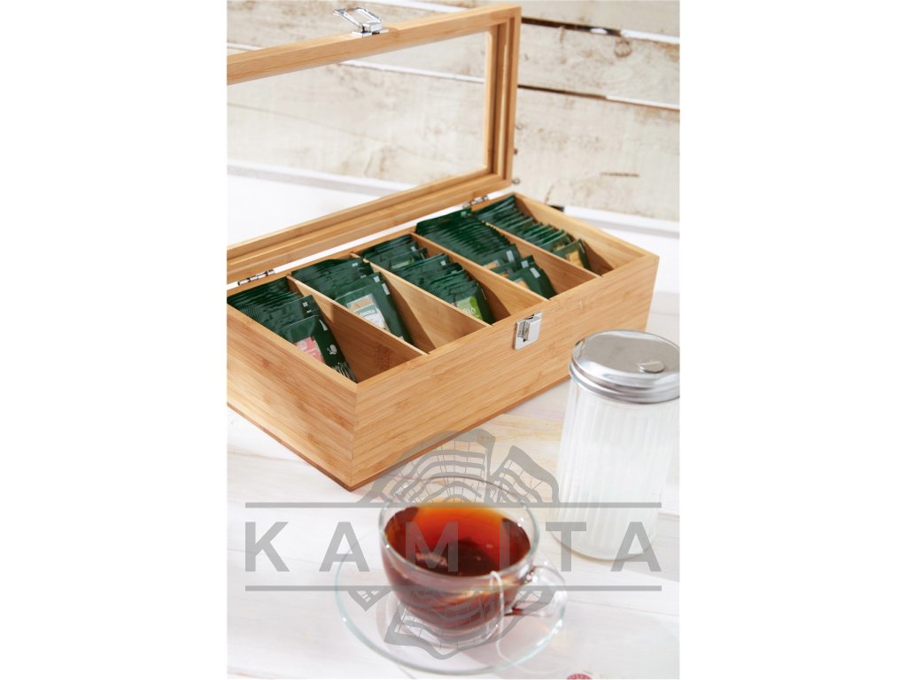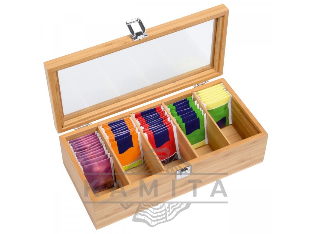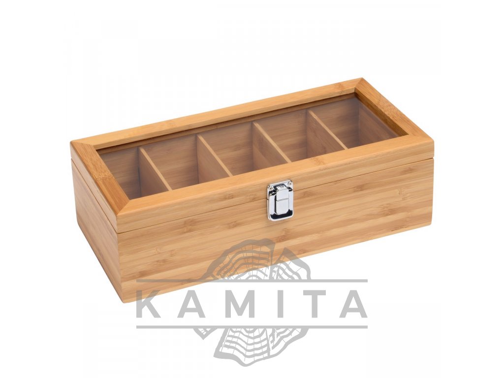 Krabička Na Čaje Tea Lounge Z Bambusu, S 5 Oddělenými Přihrádkami Na Čajové Sáčky, Se Skleněným Víkem A Uzavíráním.