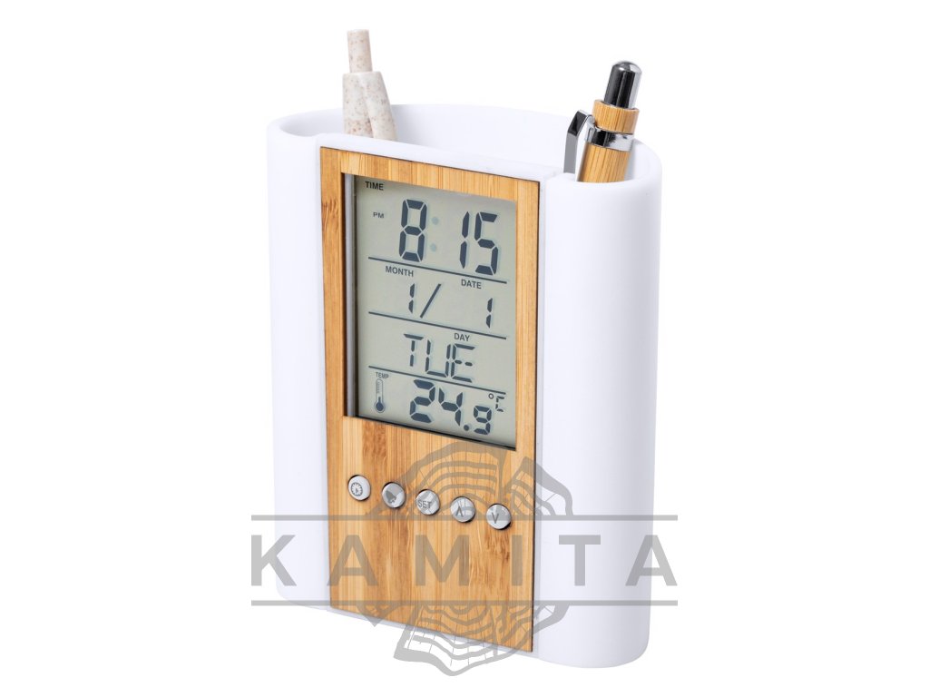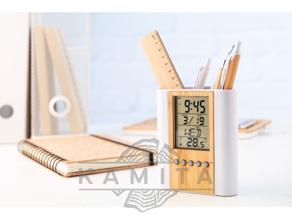 Multifunkční plastový stojánek na pera s bambusovým předním panelem a digitálním displejem. Funkce: teploměr, zobrazení času a data. S knoflíkovou baterií.