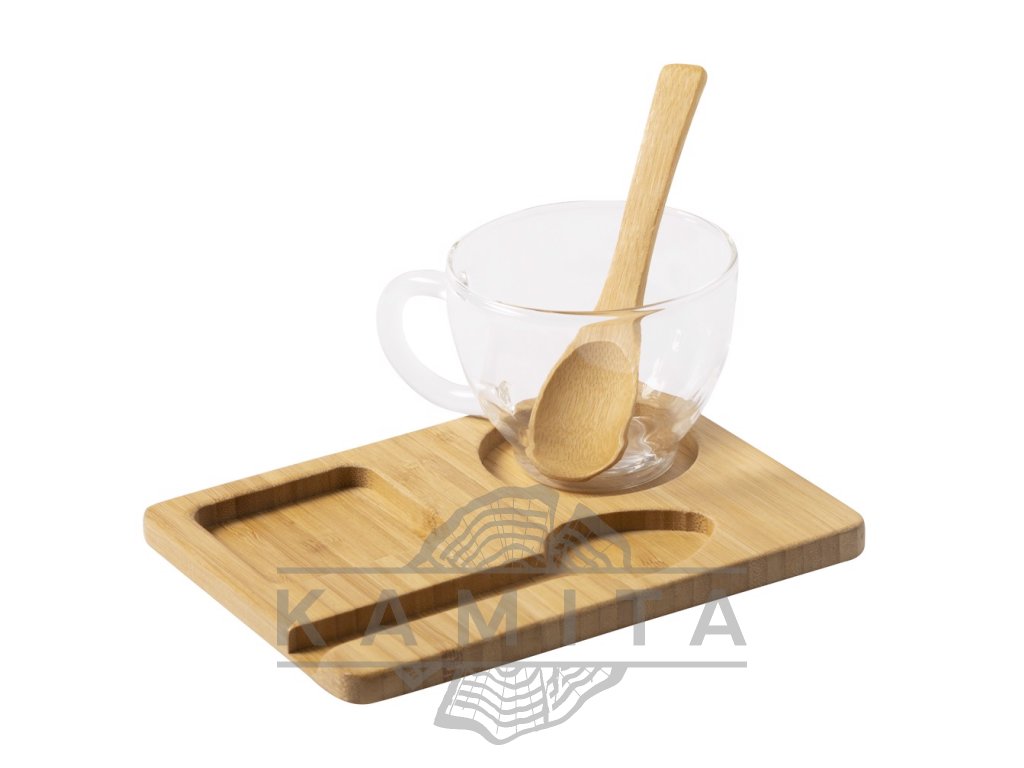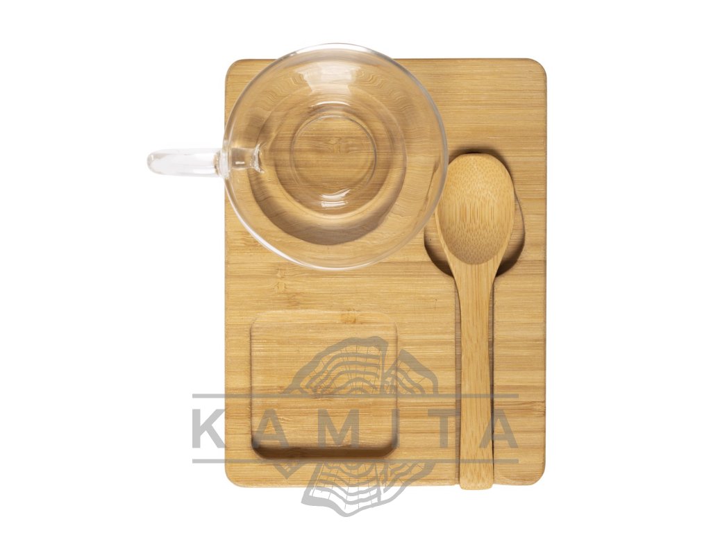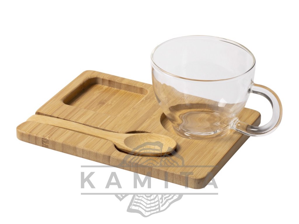 Šálek z borosilikátového skla s bambusovým podnosem a lžičkou, 180 ml. V krabici z kraftového papíru.